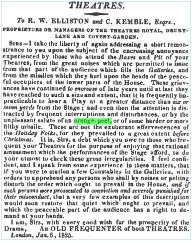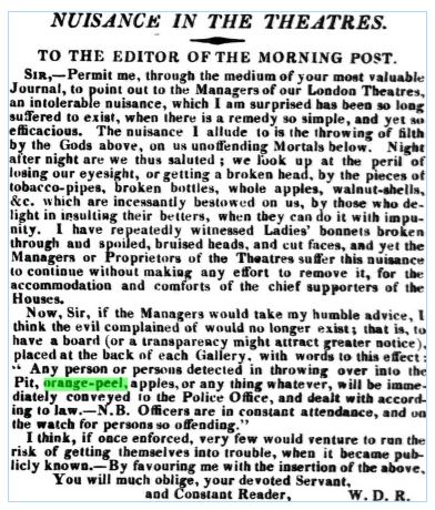 Just over two years after a letter was written to the Morning Post to comment on the disastrous orange peel affliction and suggest a possible solution, another was written making similar comments and suggesting the same solution. One has to wonder if this was the same person on a long quest. Alas despite their continued campaign of letters to the editor every two or three years there are further accounts of the orange peel dangers at theaters. We recommend always bringing a thick hat or helmet as a wealthy patron and a good pound of peels as a lower class gallery member.